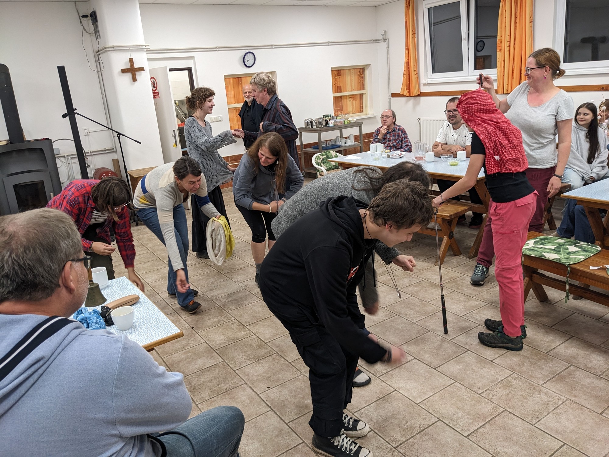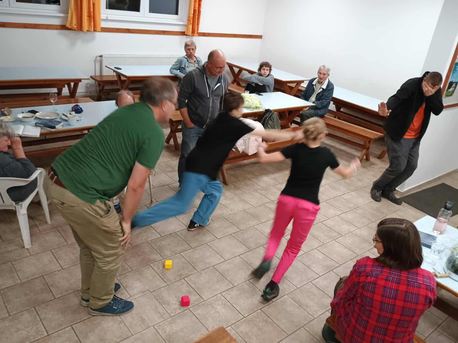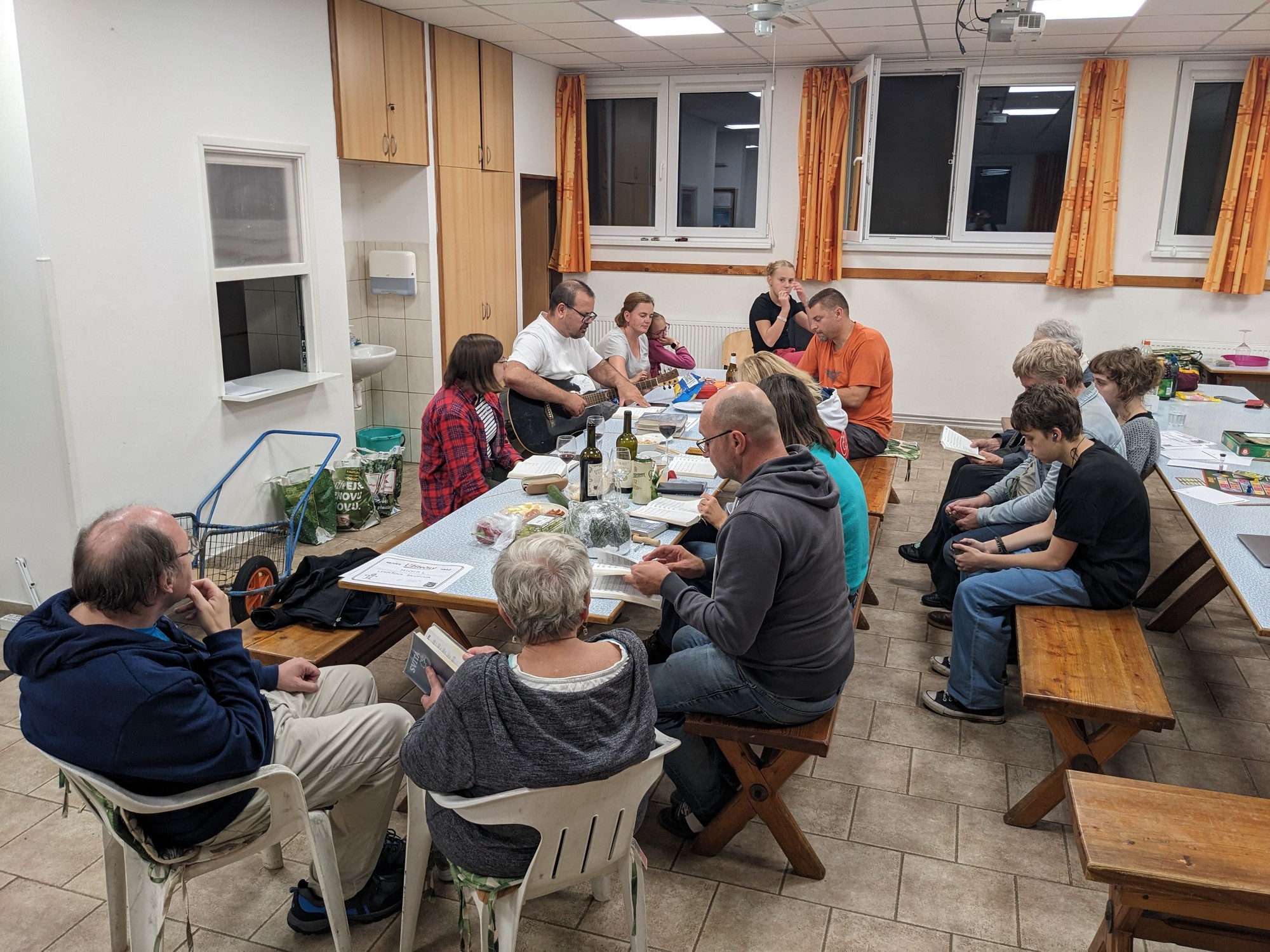 Páteční večer jsme věnovali několika zábavným hrám pro mladé i staré pod přípravou Dana Šťastného. A zbylo i dost času na zpívání svítákovek s Ondřejem Kolářem (jiného aktivního kytaristu žel sbor stále nemá).