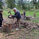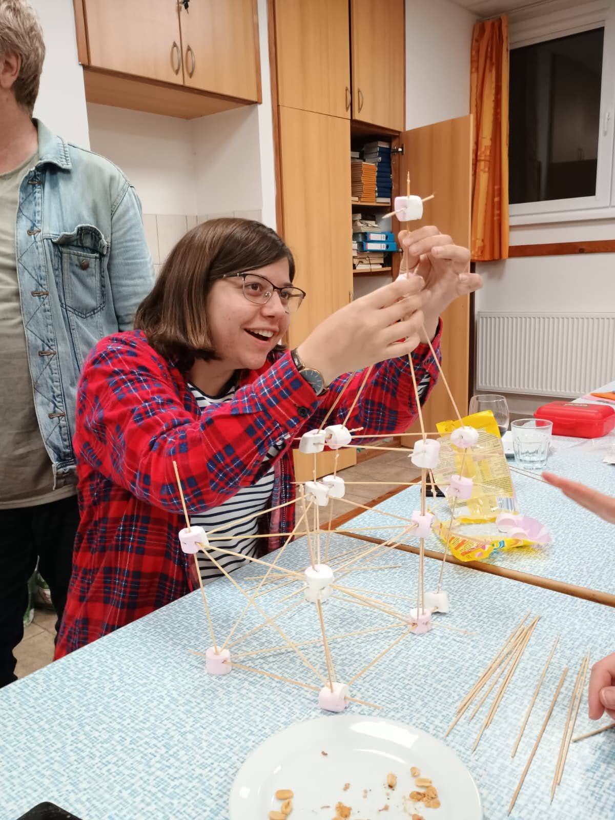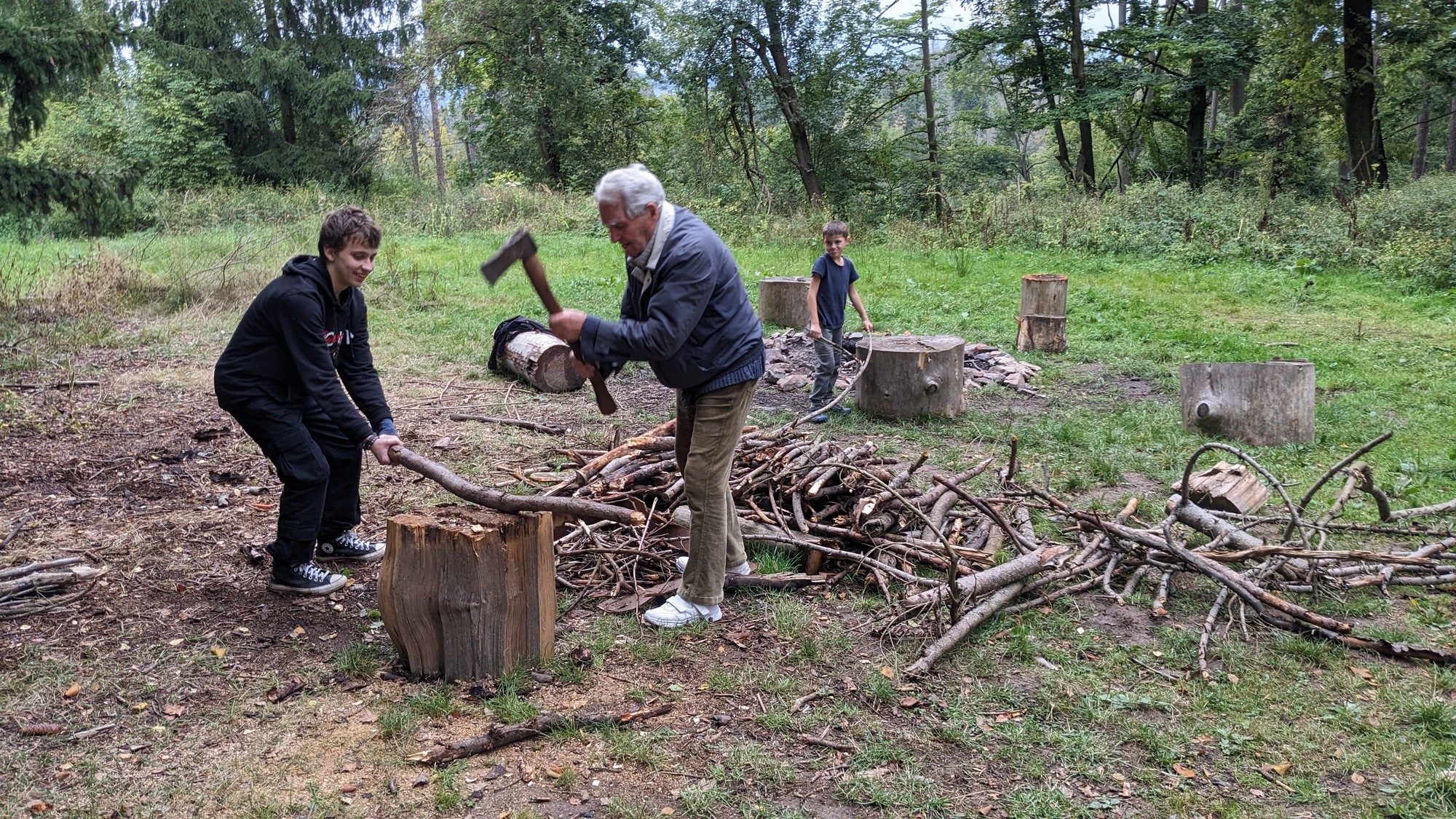 Výlet se protáhl do pozdního odpoledne (někteří to vzali domů delší cestou kolem řeky Doubravky). A tak jsme akorát stačili pomoci Lukášovi dokončit večeři a připravit táborový oheň na večer. Po večeři jednotlivá družstva pantomimicky předvedla biblický příběh, který secvičovali na výletě. Ostatní pak více či méně úspěšně hádali, o jaký příběh se jedná.